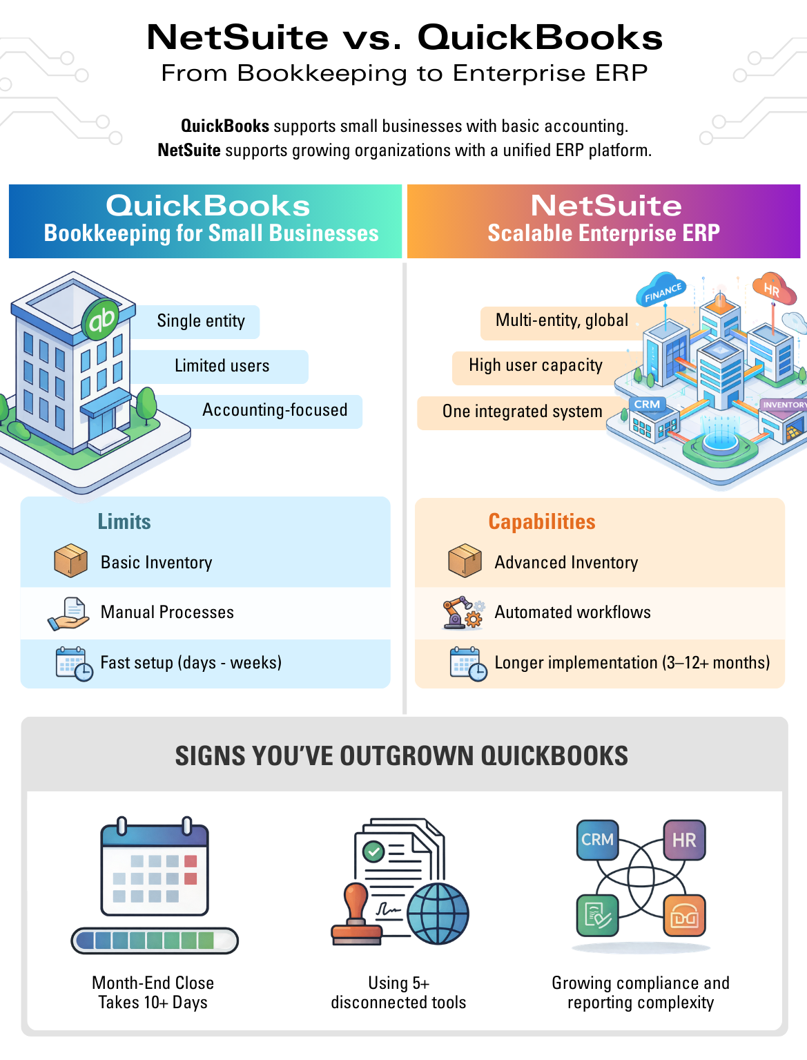 They serve different purposes. QuickBooks is accounting software for simpler operations. NetSuite is a full ERP platform designed to manage operational complexity.